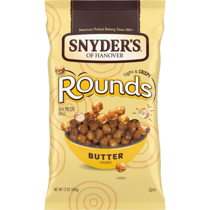 Have a ball with Snyder's of Hanover Butter Flavored Rounds pretzels! Light and crispy, these bite-sized mini pretzel balls are baked to perfection. Perfectly pop-able, Snyder's of Hanover Rounds bring a fun dimension to snack time that's incredibly delicious, too. Butter pretzel rounds have a buttery flavor.