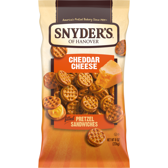 Enjoy the smooth flavor of cheddar cheese and the snap of pretzels with Snyder's of Hanover Cheddar Cheese Filled Pretzel Sandwiches. With a a rich & creamy filling sandwiched between two crunchy, bite-sized pretzels, these pretzel sandwiches are the perfect combination. These cheddar cheese pretzel sandwiches are made in a facility that does not process peanuts.