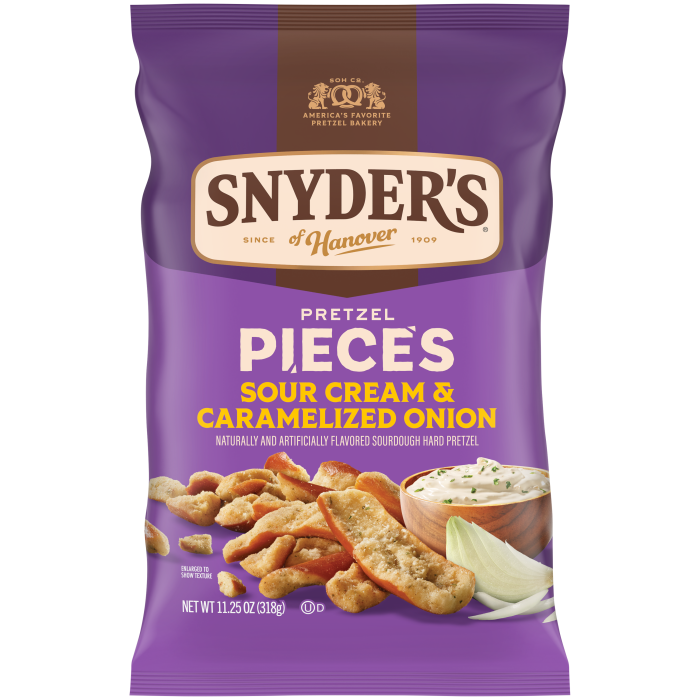 Bite into craveable flavor and hearty crunch with Snyder's of Hanover Sour Cream & Caramelized Onion Flavored Pretzel Pieces! Bursting with big flavor, these crunchy sourdough pretzels are generously seasoned with sweet onion and tangy sour cream flavors. Enjoy the hearty, crunchy satisfaction and bold flavor found in every bite of these Snyder's of Hanover Pretzel Pieces.